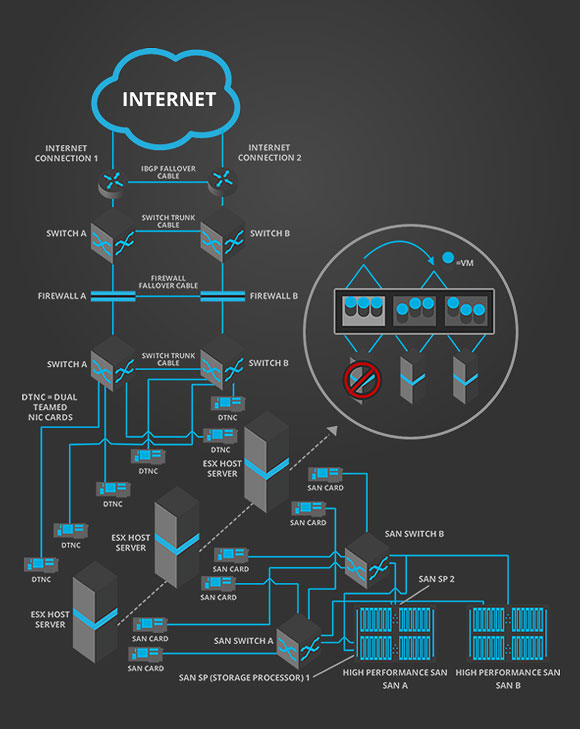 Our “Private Cloud” hosting platform combines industry leading server virtualization software and storage area network technologies in a highly fault tolerant configuration.